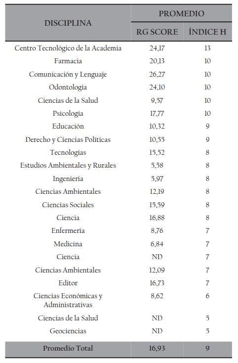 Aunque se necesita más información, y seguir realizando y actualizando estudios (Mas-Bleda, Thelwall, Kousha & Aguillo, 2014; Ortega & Aguillo, 2014); para este caso, las dos fuentes presentadas (GSC, RG) y los dos indicadores analizados (índice h, RG-Index) también presentan comportamiento diferencial según la disciplina.