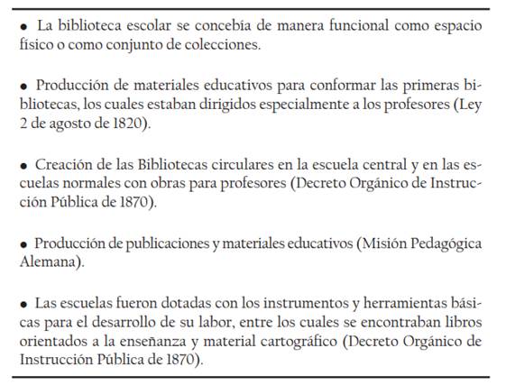 Con base en lo anterior, vale la pena pensar en el trayecto histórico, normativo y las iniciativas que han sustentado el espacio de la biblioteca escolar al interior de la institución educativa, y cómo, a través del tiempo, fue tomando sentido la importancia de la biblioteca como facilitadora de la educación. El recorrido histórico que lleva a la consolidación de la biblioteca escolar como organismo pedagógico e institución social, dentro de la escuela, se encuentra inserto en una serie de acciones que partían más de la necesidad de brindar una dotación de textos, materiales didácticos y recursos tecnológicos, es decir, de facilitar elementos didácticos para cumplir su papel práctico e instrumental, que de permitir la creación y disposición de un espacio para los libros que pudiera asociarse al concepto de biblioteca.