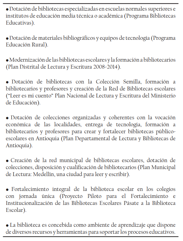 En el contexto de las políticas para el mejoramiento de la calidad educativa de la ciudad, la línea rectora N.O 5 denominada “Estrategias Bibliotecas Escolares” se propone una serie de acciones tendientes a favorecer la cualificación en cuanto a las dimensiones de contenidos bibliográficos impresos y virtuales, personal bibliotecario, infraestructura locativa, servicios y planes para el fomento de la lectura y la escritura. Además, se sugieren acciones estraté- gicas como la estructuración de la Red de Bibliotecas Escolares y su articulación al Sistema de Bibliotecas Públicas de Medellín reconociendo la importancia de establecer redes de trabajo colaborativo que faciliten la inversión de recursos y esfuerzos, y la priorización de metas educativas, culturales y bibliotecarias para la ciudad (Alcaldía de Medellín, 2014, p. 11).