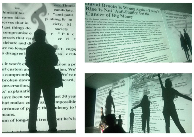 Rafael Lozano-Hemmer, en su obra Al aire/Airborne, utiliza computadoras conectadas a Internet, cámaras de vigilancia y proyectores para reflejar en los muros de una sala del Museo Universitario de Arte Contemporáneo (en adelante MUAC), de la Ciudad de México en 2015-2016, noticias de las agencias EFE, Notimex, AlterNet, AP, Reuters, por mencionar algunas. A diferencia de otras exposiciones donde los proyectores se ocultan para evitar la interferencia con los visitantes, en este espacio de exhibición las siluetas del público se interponen, si así lo desean, con los textos reflejados en las paredes del recinto. Los contenidos escriturales que se publican e intercambian en intervalos de tiempo y al contacto con las siluetas humanas pareciera que se difuminan o se fusionan, según la óptica e interpretación observada (Imagen 1). La obra de Lozano-Hemmer presenta la transitoriedad de las noticias y la interconexión, permitiendo así la fusión de los acontecimientos, vía las noticias de las agencias, el interés de los asistentes al museo y la intersección de estos con la textualidad proyectada.