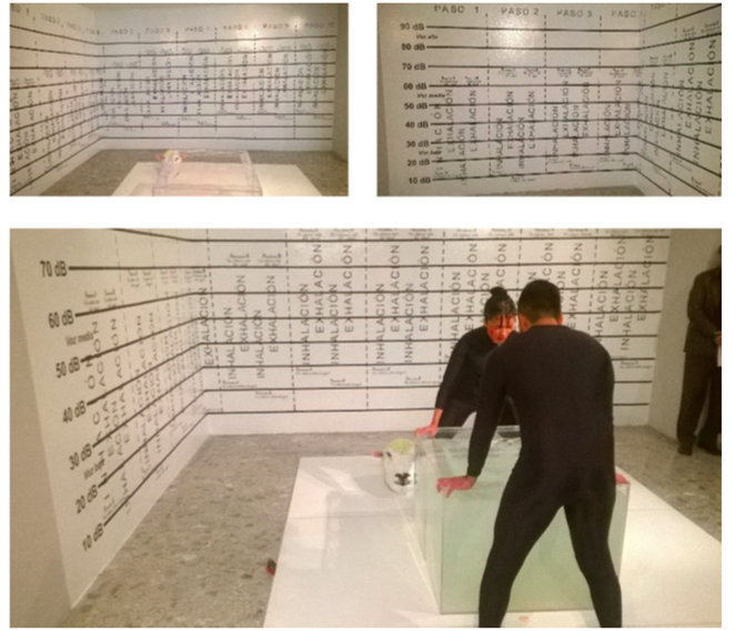 A diferencia de la propuesta de Lozano-Hemmer, en la que los textos se caracterizan por su actualización constante, podemos mencionar un ejemplo distinto, en el cual las leyendas textuales han sido predefinidas e integradas secuencialmente en los muros del Museo de Arte Carrillo Gil en 2016. En este recinto Alicia Medina presentó su obra Solo a dos voces, conformada por gráficos (resina de concreto, vinil auto adherible, grafito y tinta) y acción en vivo (performance). Los gráficos presentan secuencias de instrucciones “PASO 1” …” PASO 10”, “10dB” …”90 dB” y enunciados como “INHALACION, EXHALACION” [sic] y otros textos; durante el performance participaron un hombre y una mujer (Imagen 3). En la presentación de la obra de Medina, circunscrita en el marco de la ceremonia de inauguración, el ritual preparado con anticipación y presentado en el formato de performance y la interacción de los asistentes hacen del acompañamiento de la escritura prediseñada y presentada a manera de gráficos un ritual colectivo donde se fusionan los sentidos, el auditivo y el visual principalmente.