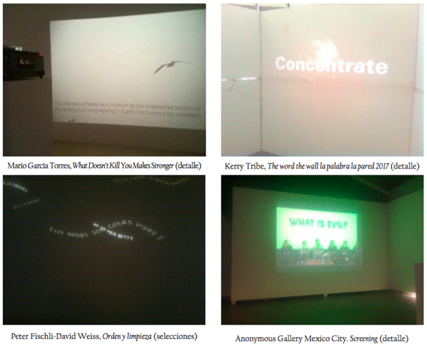 En la misma Imagen 4 se presentan dos casos más donde se utilizaron proyectores. La primera obra es The word the wall (la palabra la pared), 2016, de Kerry Tribe, exhibida en Parque Galería en la Ciudad de México. En tanto que en la segunda pieza, donde se utiliza un muro para su proyección, se presenta una serie denominada Screening en Anonymous Gallery Mexico City en 2017, en la cual participaron “A. K. Burns, Casey Jane Ellison, Haribo (Jessie Stead, Raúl De Nieves, Nathan Whipple), Havi, Javier Ocampo Hernandez, Jon Wang, Melissa Brown, Phoebe Collings-James, Puppies Puppies, Stanya Kahn, Rainer Ganahl, Tabita Rezaire, Tschabalala Self” (Anonymous Gallery Mexico City, 2010).