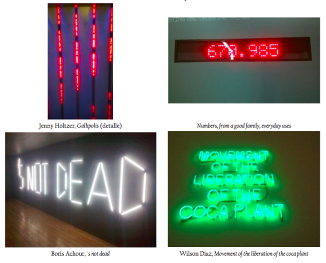 Además de los instrumentos de proyección de imágenes y texto, se encuentran otros artefactos luminosos: diodos, tableros electrónicos y bombillas (focos). En el primer caso encontramos la instalación Gallipolis de Jenny Holtzer, preparada para el Museo Guggenheim (Bilbao) desde 1997, y expuesta en 2015. La obra consiste en un diodo luminoso con textos y efectos de transición (Imagen 5). En otro ejemplo se observa un tablero que muestra la cantidad de accesos a la sala del museo, misma que se actualiza automáticamente al ingreso de una o varias personas a la exposición Numbers, from a good family, everyday uses en el Museo Caixa Forum (Zaragoza, España) en 2015. Dicho recuadro muestra el último número de personas ingresadas al recinto: “670.985”. Por otra parte, se puede mencionar una pieza en la cual se usan textos luminosos: Movement of the liberation of the coca plant de Wilson Díaz (Movimiento de la liberación de la planta de coca). Dicha instalación se presentó en 2016 en el Museo Fundación Júmex Arte Contemporáneo y consiste en luces tubulares cuyos contornos describen el texto: MOVEMENT OF THE LIBERATION OF THE COCA PLANT. También, en la misma Imagen 5, se incluye un ejemplo más, en el cual se usan tubos luminosos, cuyo título y contenido textual es 's not dead de Boris Achour. Obra exhibida en el Museo experimental el Eco (ciudad) en un periodo de 2016-2017, bajo el lema El tiempo dirá.