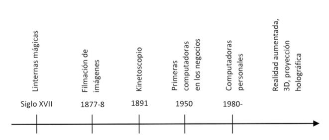 Ante el éxito y demanda de las linternas mágicas, los técnico-científicos apuraron el paso para investigar, experimentar y plantear nuevas propuestas para la proyección de imágenes y texto. Así, podemos mencionar que, en el periodo 1877-1878, Eadweard Muybridge se interesó por la filmación de imágenes, la cabalgadura del caballo, con la ayuda de dos docenas de cámaras para dar paso así al kinetoscopio en 1891. A partir de este invento, ya en el 1950 aparecen otros implementos que revolucionarían desde la planeación, el diseño y la preparación de imágenes, texto y sonido; estamos refiriéndonos a la primera computadora en los negocios. Posteriormente, en la década del ochenta, aparecen las primeras computadoras de uso personal (PC’s: Personal computers). Y, a partir de los desarrollos de las tecnologías de la información y la comunicación, las formas de proyección se han diversificado (realidad aumentada, 3D, holografía, entre otras) (Figura 1).