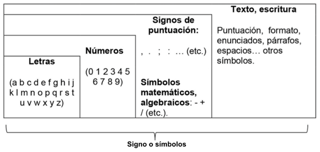 En el primero, el segundo y parte del tercer párrafo de esta sección se inicia con la descripción de los conceptos propuestos por la Real Academia Española (en adelante RAE), y en segunda instancia, estos conceptos se enlazan con los términos especializados, símbolo e información, con el enfoque de la ciencia de la información. Por escritura se entiende el “Sistema de signos utilizados para escribir…” (RAE, 2014, p. 936) y, en consecuencia, en el examen de este término se presenta la necesidad de precisar el concepto signo. Entonces, por signo se comprende: a) la “señal o figura que se emplea en la escritura y en la imprenta”; b) la “unidad mínima de la oración, constituida por un significante y un significado; y c) la “marca gráfica, sin ser letra o número, se emplea en la lengua escrita para contribuir a la correcta lectura e interpretación de palabras y enunciados; por ejemplo, los signos de puntuación” (RAE, 2014, p. 2010).