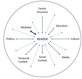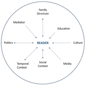 It can also be observed in Figure 2 that a simple relation, which offers no expression of reply active in reader, does not determine a general position because reader has a reciprocal relation with all other factors (family structure, social and temporal contexts and politics).