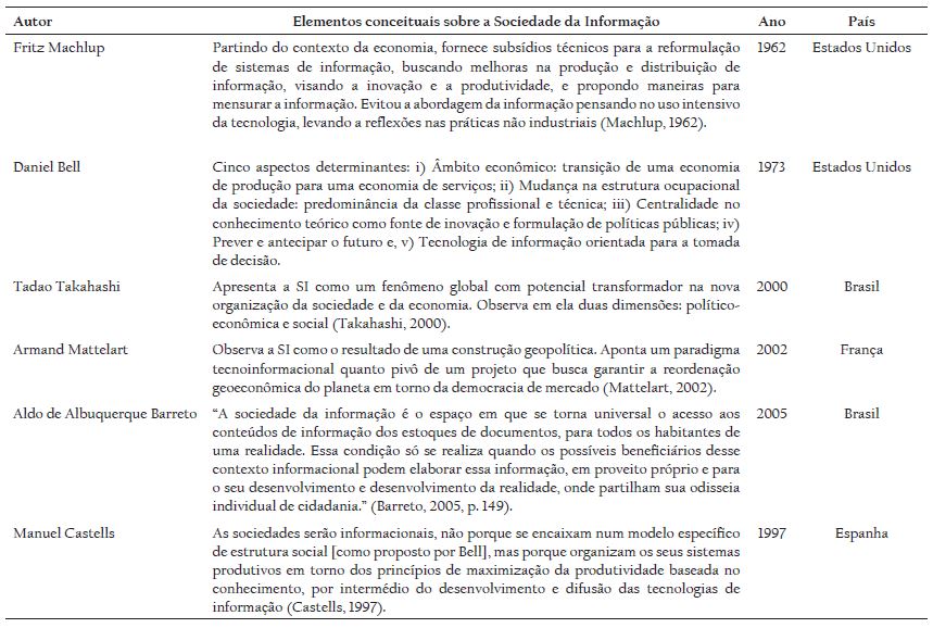 A Tabela 1 sintetiza algumas das principais definições e características da sociedade da informação, utilizando autores seminais sobre a temática, incluindo os que atuam no campo da CI.