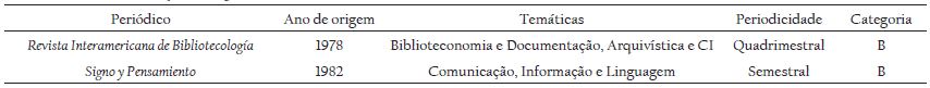 A Revista Interamericana de Bibliotecología é editada pela Universidad de Antioquia. Essa faculdade oferece o curso de graduação em Bibliotecología e o programa de mestrado em Ciencia de la Información. A revista Signo y pensamento é editada pela Universidad Javeriana, quem oferece o curso de graduação em Ciencia de la Información - Bibliotecología adscrito à Faculdade de Comunicación y Lenguaje. Considerando que o sis tema Publindex classifica os periódicos indexados em ordem de estrato descendente como A1, A2, B e C, ao consultar os dois periódicos no sistema Publindex, observa-se que tanto Revista Interamericana de Bibliotecología quanto Signo y Pensamiento estão classificados como B.