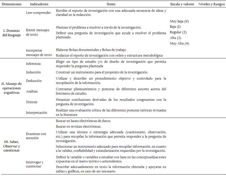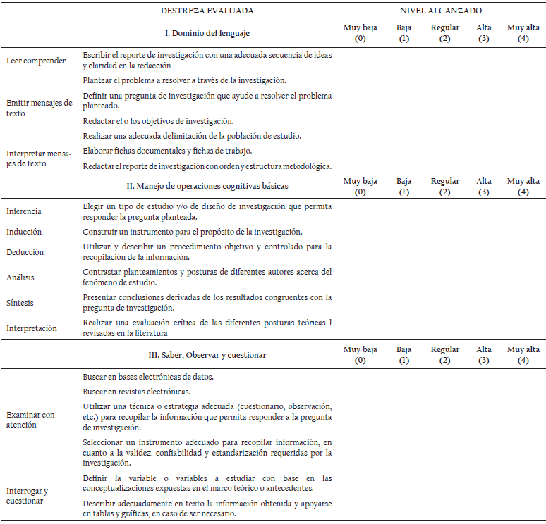 La variable en la que se pretende lograr una modificación es “destrezas investigativas”, la misma que se está considerando como una variable de tipo cualitativa, medida a escala ordinal (muy alta, alta, regular, baja, muy baja), operacionalizada en dominio del lenguaje; manejo de operaciones cognitivas; saber, observar y cuestionar; construcción social del conocimiento y construcción social del conocimiento nuevo (véase Anexo 1).