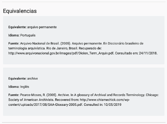 La búsqueda de los equivalentes en portugués e inglés suele suponer cierta dificultad, pues no se trata de una mera traducción literal de denominaciones, sino de encontrar aquellos términos que representen el mismo concepto para los archivistas locales. Se llama la atención sobre la necesidad de involucrar a los traductores con formación en terminología en este tipo de trabajos. Esta estrategia, sin duda, presenta un doble beneficio. Por un lado, permite que los recursos terminológicos se ajusten a las necesidades de los traductores y, por otro, permite que la asignación de equivalentes de los términos en otras lenguas se haga con mayor rigor, lo cual contribuye a dar confiabilidad a recursos como las bases de datos terminológicos.