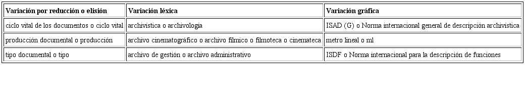 A continuación, la Tabla 1 muestra una selección aleatoria de casos de variación denominativa encontrados en la BDT de archivística.