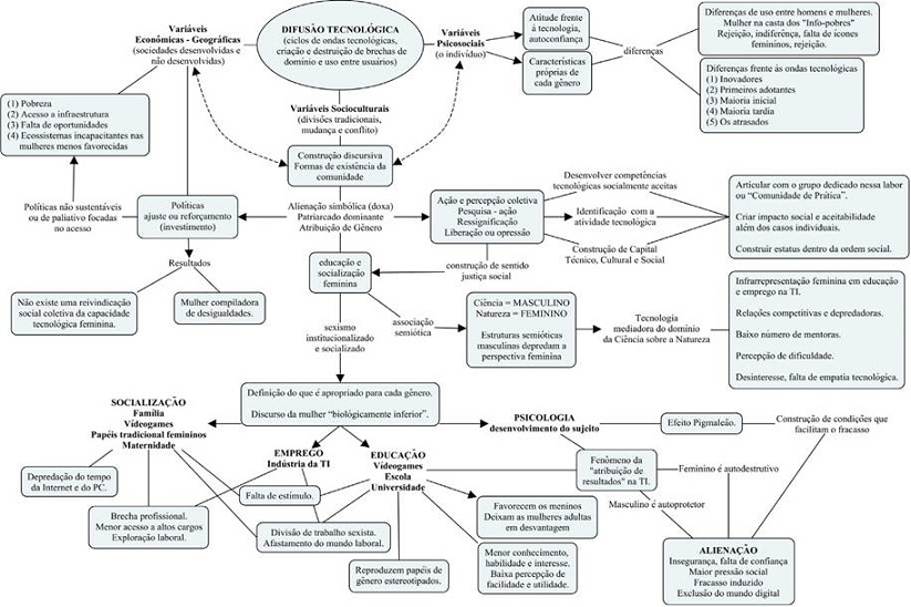 O idealismo digital dos anos 1970 esperava que as TIC fossem uma força libertadora, mas sendo produto e patrimônio de uma sociedade patriarcal, esta tecnologia reproduziu a estrutura de poder das suas origens. Para mudar isto, a chave parece estar nos fatores sociotécnicos que mantêm a associação entre o masculino, a ciência e a tecnologia. Os modelos aqui citados dão conta de uma ampla gama de fatores que incidem na continuidade da EDG, que são resumidos a continuação e são a base do mapa conceitual proposto na Figura 1: