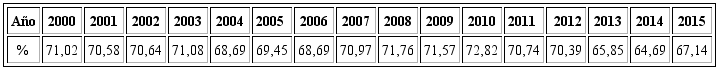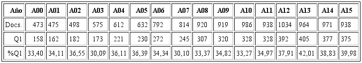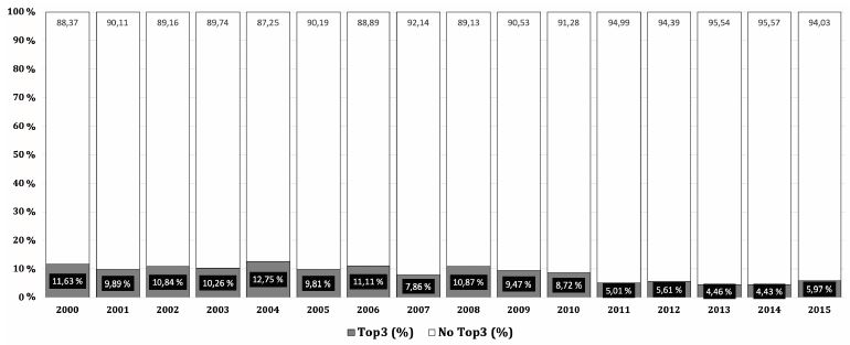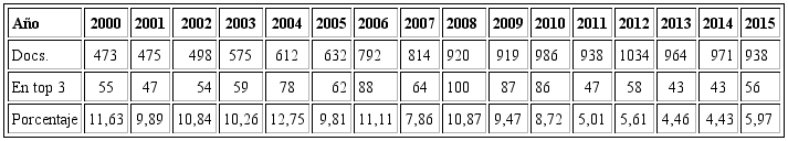 Otra medida de impacto es el porcentaje de publicaciones en las tres primeras revistas, las de mayor factor de impacto, en cada disciplina. Como se aprecia en la Figura 3 y en la Tabla 5, este indicador muestra valores en torno al 10 % hasta el año 2010, con un mínimo de 7,86 % en 2007 y un máximo de 12,75 % en 2004. Sin embargo, hacia el final del periodo hay una disminución notable, con el 5,97 % como el valor más alto en 2015. El análisis por cuatrienios confirma lo anterior, pues se pasa de un valor promedio de 10,66 % (2000-2003) a un 5,12 % (2012-2015).