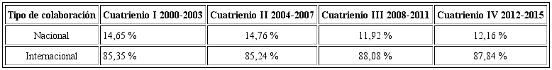 Tomando en cuenta los totales anuales de documentos con colaboración, la colaboración internacional está por encima del 80 % durante todo el periodo estudiado, con un valor mínimo de 81,41 % en el año 2004 y un máximo de 89,94 % en el 2007. Este indicador se relaciona con el mejoramiento de la visibilidad, el impacto de la producción científica y, en general, la calidad de la investigación y el desempeño académico (Hsu & Huang, 2011; Aldieri, Kotsemir & Vinci, 2018). La colaboración nacional se ha mantenido por encima del 10 % en todo el periodo, con un máximo de 18,59 % en 2004 y un mínimo de 10,06 % en 2007. Los valores promedio por cuatrienios muestran una ligera disminución, dado el aumento de la colaboración internacional.