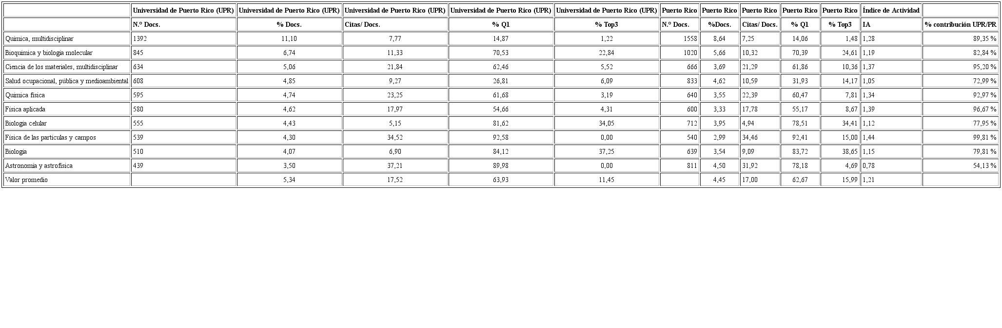 Por último, la aportación de la UPR a la producción de Puerto Rico en estas diez áreas es muy alta, en nueve de ellas por encima del 70 % y superiores al 90 % en física de partículas y campos (99,81 %), física aplicada (96,67 %), ciencia de los materiales, multidisciplinar (95,20 %) y química física (92,97 %). La aportación es menor solamente en astronomía y astrofísica (54,13 %). A rasgos generales, este análisis confirma la importancia del esfuerzo de investigación que se realiza en la UPR y lo determinante que resulta en la actividad científica de Puerto Rico.