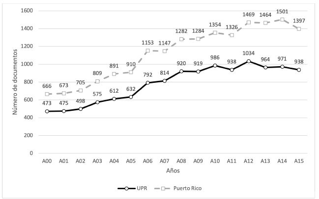 En valores absolutos, la producción de la UPR aumentó desde los 473 documentos publicados en el año 2000 hasta los 938 del 2015, lo que representa una tasa de crecimiento en el periodo de 98,31 %. Este crecimiento, que es sostenido entre los años 2000 y 2012, se estabiliza entre 2013 y 2015. En cuanto a la aportación anual al total de la producción del país, la Tabla 1 muestra que esta se mantiene en torno al 70 % hasta el año 2012, con un mínimo de 64,69 % en 2014 y un máximo de 72,82 % en 2010, disminuyendo ligeramente en los tres últimos años del estudio, lo que parece indicar un aumento en la producción de otros sectores del país.