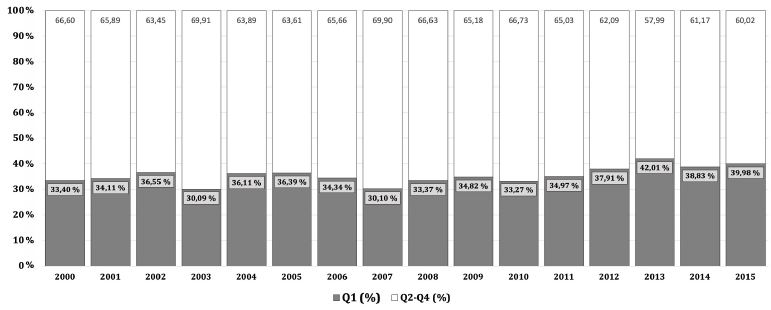 La Tabla 4 y la Figura 2 muestran el impacto de la producción científica de la UPR, tomando en cuenta las revistas donde sus autores publican. Como se aprecia, las publicaciones en el primer cuartil, que agrupa el 25 % de las revistas con mayor factor de impacto, superan el 30 % de la producción total durante todo el periodo, con un ligero crecimiento en los últimos años. Por cuatrienios, este porcentaje se ha incrementado gradualmente desde un 33,54 % (2000-2003) hasta un 39,68 % (2012-2015).