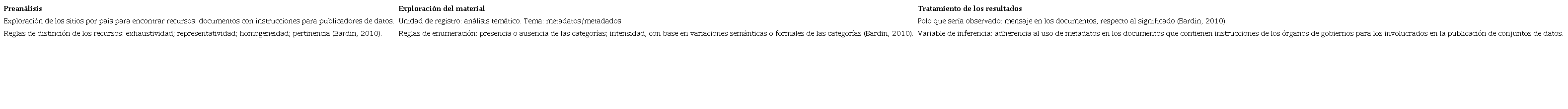 Para este estudio, se desarrolló un análisis que permitiera inferir el panorama sobre las indicaciones que dirigen el uso de metadatos durante el proceso de publicación de conjunto de datos en los sitios de datos abiertos de los gobiernos de Brasil, Colombia, España y Portugal.