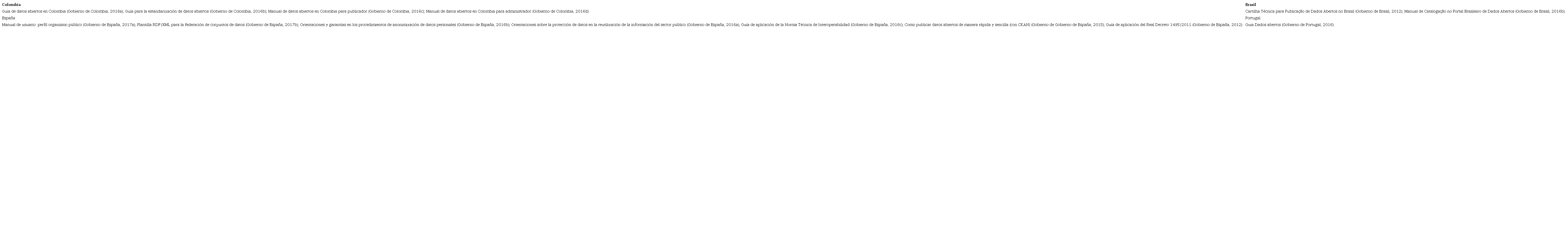 Los sitios de datos gubernamentales para los estudios de caso son, respectivamente, Colombia: https://datos. gov.co/; Brasil: http://dados.gov.br/; España: http://datos.gob.es/; y Portugal: http://www.dados.gov.pt/pt/inicio/inicio.aspx