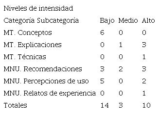 La Tabla 3 permite visualizar estas categorías junto a los niveles de intensidad con que fueron desarrolladas, así como las ocurrencias que surgieron en el análisis.