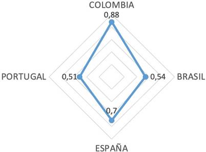 Como se indicó, el desempeño de Colombia fue destacado, a pesar de ser uno de los países en proceso de adhesión. Se observa mayor puntuación en relación con los otros países, clasificados en orden decreciente: Colombia, España, Brasil y Portugal.