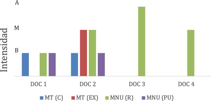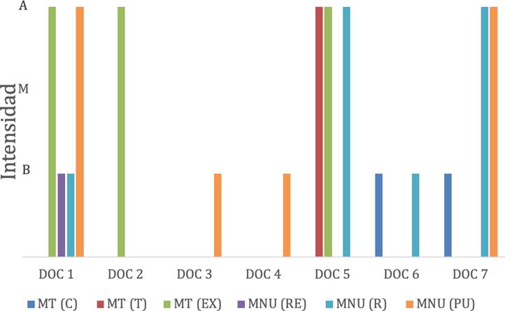 Los documentos analizados presentan referencias a las categorías con niveles de intensidad a menudo bajos y medios; sin embargo, hay que destacar que, de las seis categorías, en cinco de ellas al menos un documento fue abordado con intensidad alta.