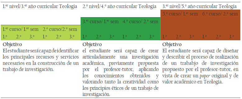 A partir de lo anterior, se vio la necesidad de entender cómo contribuir al desarrollo de competencias informacionales e investigativas en los estudiantes de Teología de la Pontificia Universidad Católica de Chile, desde la integración pedagógica del currículo. Así, el objetivo de la investigación fue desarrollar y generar en los estudiantes de licenciatura en Teología competencias informacionales e investigativas, para que sean capaces de buscar, seleccionar, evaluar, registrar y utilizar la información de manera rigurosa, creativa, eficaz y ética. Estas competencias se analizaron con base en un trabajo de investigación semestral de acuerdo con los objetivos del curso, con el fin de contribuir al desarrollo de la integración pedagógica del currículo. Los objetivos específicos que orientaron la investigación fueron considerar la importancia de las competencias informacionales e investigativas por parte de los estudiantes y los docentes de licenciatura de Teología; justificar el uso, la búsqueda, la selección y el registro de las competencias informacionales de forma rigurosa, creativa, eficaz y ética en el diseño de un trabajo de investigación en cada semestre; gestionar y organizar por parte del bibliotecólogo el buen proceder del desarrollo de la enseñanza-aprendizaje de las competencias informacionales e investigativas durante la licenciatura de Teología, en diálogo entre estudiantes y docentes; y establecer vínculos de colaboración entre los docentes y el bibliotecólogo de Docencia y Aprendizaje.