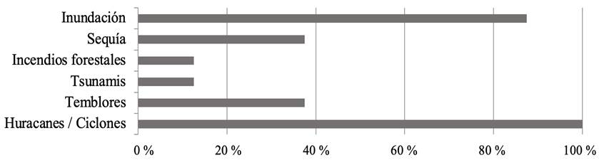 Estas comunidades están expuestas a desastres naturales, como huracanes/ciclones (100,0 %), inundaciones (87,5 %), terremotos (37,5 %), sequía (37,5 %), tsunamis