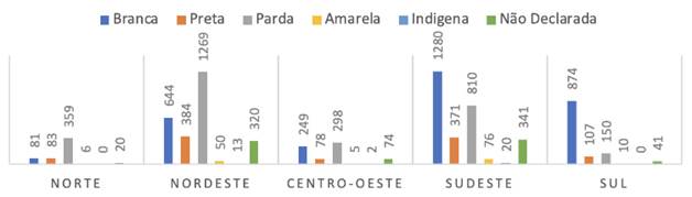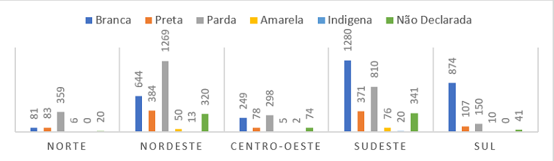 Os microdados do Censo de ensino superior de 2019 disponibilizado pelo Inep (2020a) revelou que o quadro de ingressantes do curso de Biblioteconomia no Brasil é formado majoritariamente por mulheres brancas, com significantes variações regionais. Se nos cursos ofertados no sul e sudeste há concentração de discentes brancos, nas regiões norte e nordeste predominam ingressantes pretos e pardos. Essa situação não é estranha porque reflete a distribuição racial no Brasil.