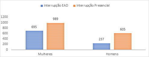 Na modalidade EaD, o maior percentual de interrupção do curso está entre os indígenas (62,5%), seguidos da cor-raça amarela (27,12%); preta (26,88%). Os das cores-raças branca e parda apresentam percentuais de interrupção do curso muitos próximos: 25,49 e 25,41%, respectivamente. Dos que não declararam cor-raça na modalidade, 22,99%, deixaram de frequentar o curso. Na modalidade presencial, esta ordem é alterada: a cor-raça branca é que apresenta o maior percentual de interrupção do curso (21,65%), seguida das cores-raças indígena (19,44%), não declarados (18,24%), parda, (17,72%), amarela (15,03%) e preta (14,12%).