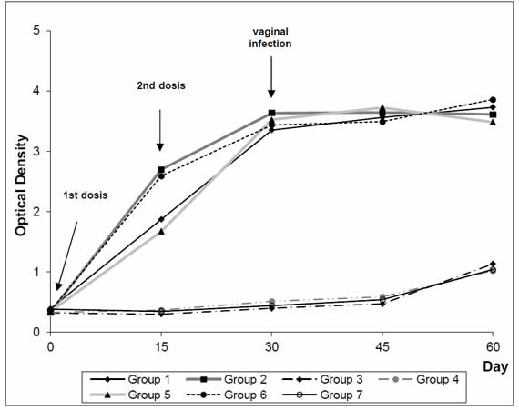 When the antibody level in vaginal mucus from different groups was analyzed, it was observed that OD values at the time of challenge by vaginal infection were very close to baseline levels obtained from the control group. At the end of the trial, little variation was observed in the antibody levels, with OD values ranging between 0.17 and 0.32 for the different groups.