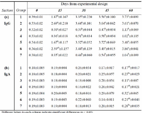 Serum Immunoglobulin G (IgG) levels. Table 2 (section a) shows averages and standard errors of the OD for serum IgG levels for each experimental group at different sampling days. Measurement of the serum immune response allowed us to observe that groups 1, 2, 5 and 6 showed a rapid systemic response to vaccination, with a level of antibodies (Ab) that lasted until the end of the trial. No systemic response was detected in groups 3 and 4; these groups presented the same pattern as the control group (Figure 1). This different behavior over time for the different groups was observed from 15 days after the first vaccination onwards (p˂0.0001). On days 30, 45 and 60, two significantly different clusters were formed (p<0.05); a cluster with groups 1, 2, 5 and 6, with similar IgG levels between them (p>0.05), and a second cluster of groups 3, 4 and 7, with IgG levels similar to each other (p>0.05) but different to the first cluster. (Error 4: La referencia: 2 está ligada a un elemento que ya no existe)