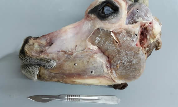 Vista lateral de la disección media del aparato masticador. Se seccionaron el nervio facial, arteria facial transversa, glándula parótida y conducto parotídeo, músculos malar y de la mímica y glándula periorbitaria. Se observan en: a) M. masetero superficial, b) M. Masetero profundo, c) M. temporal, d) M. buccinador y e) glandulas bucales.