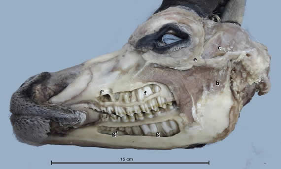 Vista lateral izquierda, disección profunda con alvéolos expuestos. Se observa: b) M. masetero profundo, c) M. temporal, e) Arco cigomático, f y f’) raíces de los molares y premolares superiores, g y g’) raíces de los molares y premolares inferiores.