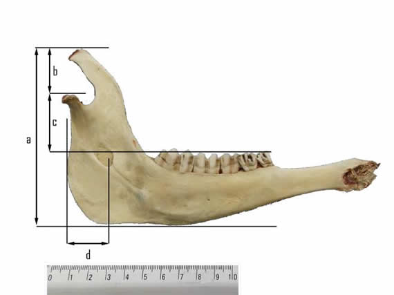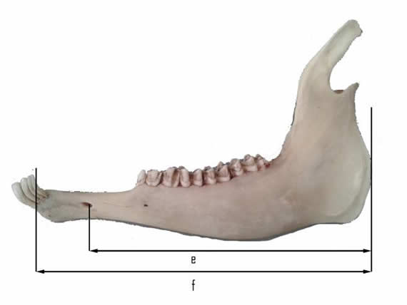 Luego de la disección de componentes blandos se limpiaron las estructuras óseas y se realizaron placas radiográficas de la dentadura y cinco mediciones de la mandíbula para comprender mejor la biomecánica del aparato masticatorio. Las variables determinadas fueron “altura de la rama mandibular” (desde el ángulo mandibular hasta el extremo del proceso coronoides); “altura del proceso coronoides” (desde la cabeza mandibular hasta el extremo del mismo); “altura efectiva” (entre la cabeza mandibular y la superficie oclusal de los molares mandibulares); “ancho de la rama mandibular” (entre el foramen mandibular y el borde caudal de la rama; “largo total” (desde el ángulo mandibular hasta el extremo incisivo de la mandíbula); “largo efectivo” (desde el borde caudal al foramen mentoniano) (Fig. 1 y 2).