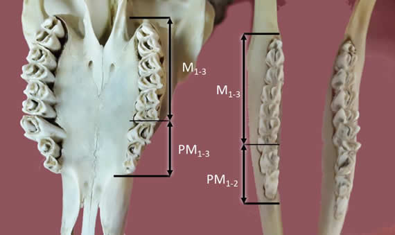 Molares. Son sensiblemente mayores que los premolares (Fig. 1, 2, 3 y 5). Sus raíces (generalmente tres con dos fusionadas) son voluminosas y se extienden más en profundidad en los respectivos alvéolos. Tienen dos o tres cúspides (paracono, protocono y metacono) posicionadas linealmente de distal a mesial respectivamente. Presentan crestas medial y lateral. Éstas últimas sobresalen del borde lateral de los molares inferiores, proyectándose por lateral a éstos. Emergen de los alveolos oblicuos en dirección dorso-rostral, a diferencia de los premolares.