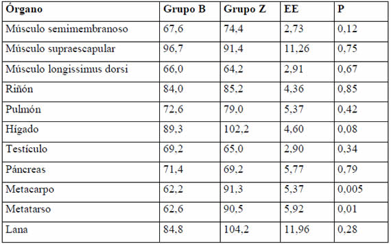 Al finalizar el ensayo, después del sacrificio de los animales, se recogieron muestras de músculo (longissimus dorsi, supraescapular y semimembranoso), hígado, páncreas, testículo, riñón, pulmón, hueso (metacarpo y metatarso) y lana para la determinación de los niveles de Zn, por espectrofotometría de absorción atómica19.