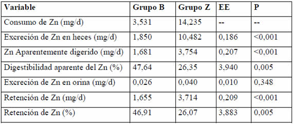 En ningún momento del ensayo los animales mostraron signos clínicos de deficiencia de Zn. El grupo Z evidenció, como era esperable, una mayor retención de Zn (en mg/día) (Tabla 1). Por el contrario, la absorción y la retención porcentuales fueron mayores en el grupo B.