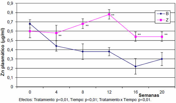 Para la variable Zn en plasma, la interacción tratamiento x tiempo fue muy significativa (P<0,01). Excepto para la medición inicial, el grupo Z tuvo mayores concentraciones de Zn plasmático que el grupo B en el resto de las mediciones a lo largo del ensayo (P<0,01). El nivel promedio de Zn en plasma fue 0,68 µg/ml en el Grupo Z y 0,40 µg/ml en el grupo B (Figura 1). Sin embargo, la suplementación con Zn no tuvo efecto sobre los niveles de FA en plasma (Figura 2).