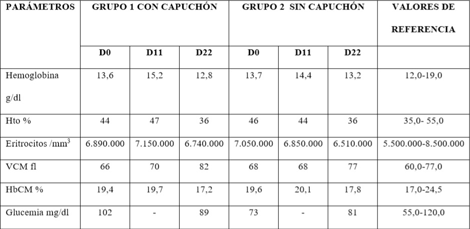 Datos hematológicos y de glucemia obtenidos mediante la extracción de sangre por punción submandibular en los 3 muestreos cada 11 días de intervalo (D0, D11, D22) con y sin capuchón.