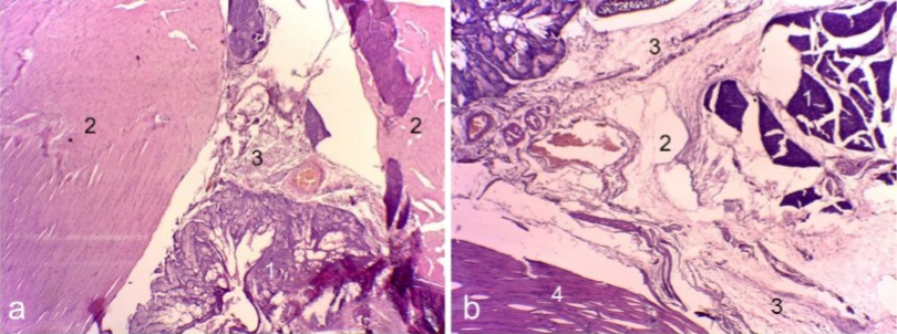 En la Figura 2 se observan las lesiones microscópicas observadas en ratones G1 (a) y G2 b), 2 h después de la última extracción de sangre (D22). a) Las fibras de colágeno del tejido conectivo (3) entre las glándulas salivales (1) y los músculos mandibulares (2) están separadas por espacios claros (edema). b) Las fibras de colágeno del tejido conectivo (3) entre las glándulas salivales (1), los músculos mandibulares (4) y los vasos linfáticos (2) están separados por espacios claros (edema) (tinción: hematoxilina- eosina 4X).