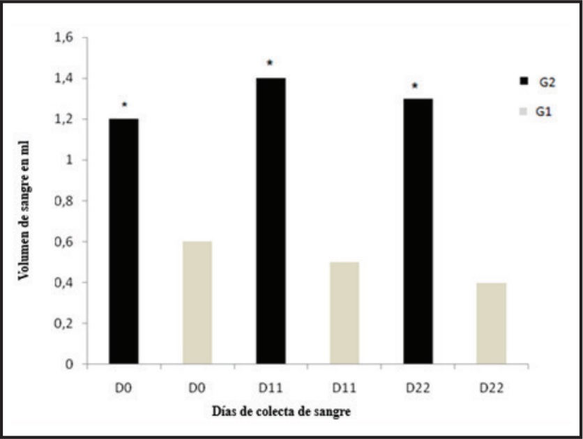 No se observaron cambios en el comportamiento de los animales o en sus hábitos alimenticios. El volumen de sangre total obtenido en el G2 fue significativamente mayor (p ≤ 0,05) que el obtenido en el G1 (Gráfico 1).