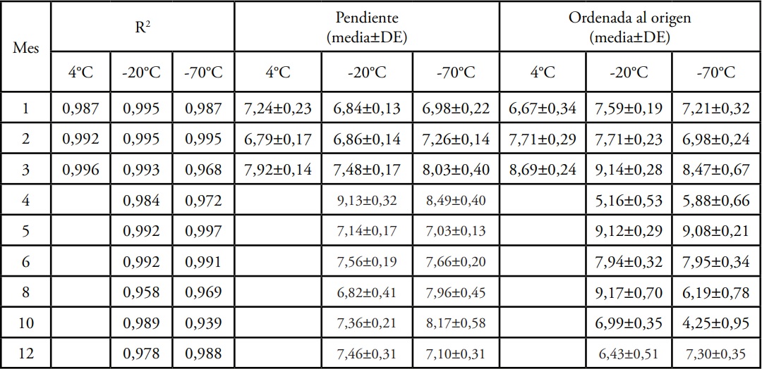 Promedio y desvío estándar de los R2 , pendientes y ordenadas al origen de las curvas de los diámetros de halo en función de la concentración de cefovecin en las distintas temperaturas de conservación (4 °C, -20 °C y -70 °C) a lo largo del tiempo (12 meses).