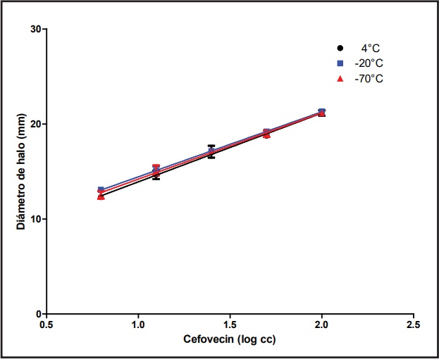 Este método se basa en la inhibición del crecimiento bacteriano y permite construir una curva de calibración relacionando el diámetro del halo de inhibición con la concentración del antibiótico. Para decidir el microorganismo más adecuado para determinar la actividad antimicrobiana de cefovecin in vitro se probaron 2 bacterias estándares, E. coli ATCC 25922 y K. pneumoniae ATCC 10031. Siendo seleccionada, según criterios de linealidad, exactitud y precisión, E. coli ATCC 259229 (resultados no mostrados en el este trabajo). Se realizó una prueba mensual donde a partir de una alícuota sometida a cada tratamiento se construyeron curvas estándares con las siguientes diluciones del antibiótico: 200, 100, 50, 10 y 5 µg/ml. Las diluciones se sembraron por triplicado en placas de Petri de 15 cm de diámetro, estériles, con agar Müller-Hinton (28 ml/placa) inoculado con el microorganismo patrón (5 x 105 ufc/ml). Luego de 18 horas de incubación a 34-35 ºC se leyeron los halos de inhibición mediante un calibre digital. Con los halos de inhibición de cada tratamiento se construyeron las correspondientes curvas del log concentración de cefovecin (ug/ ml) / diámetro del halo de inhibición (mm).