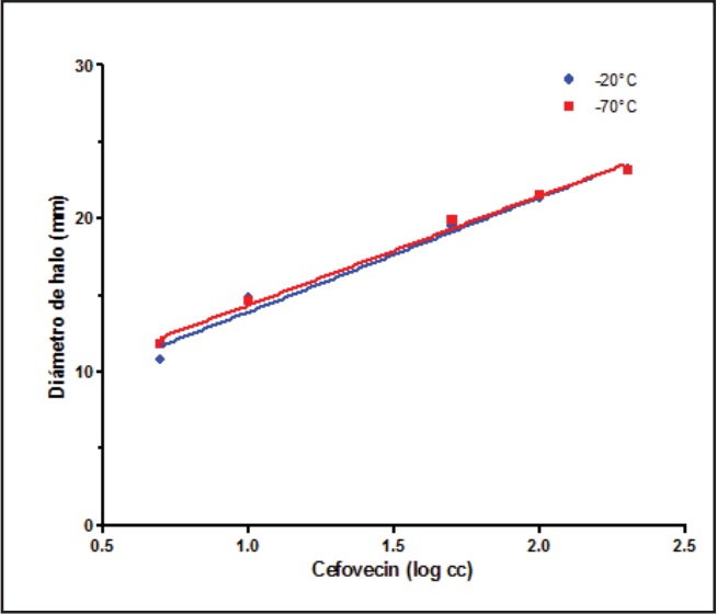 Las potencias calculadas fueron equivalentes tanto para la conservación en heladera hasta los 90 días (4 °C) como para el producto congelado hasta los 12 meses (a -20 ºC o a -70 ºC). Por esto, se puede concluir que el cefovecin reconstituido según las condiciones que indica el laboratorio productor no perdió su potencia antibiótica cuando fue sometido a congelación durante un período de 12 meses. En cuanto a la conservación en heladera, durante los 3 meses que se evaluó, cefovecin tampoco modificó su potencia, sin embargo, su coloración cambió hacia un color pardo oscuro. Si bien se reporta que, la solución reconstituida conservada en heladera por 28 días puede cambiar su color a amarillento sin modificar su potencia (prospecto cefovecin). En cuanto a la conservación congelado, la estabilidad de la potencia de cefovecin puede ser una gran ventaja en relación a su uso clínico,