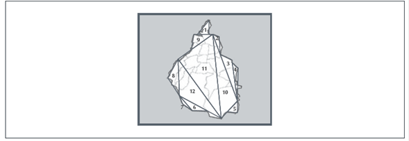 Análisis: en primera instancia, intentaremos acotar el contorno de la figura geométrica que nos permita calcular el área correspondiente. Observemos que de las tres figuras (Figura 7) el heptágono irregular es el que se aproxima con menos error al área del mapa de la ciudad. Si triangulamos el polígono, sabemos que por ser heptágono debe contener (n - 2) triángulos, es decir: 7 - 2 = 5 triángulos. Podemos afirmar que la suma de las áreas de los cinco triángulos es aproximadamente igual al área de la Ciudad de México. Área del Heptágono = T1 + T2 + T3 + T4 + T5 = Área del mapa de la Ciudad de México.