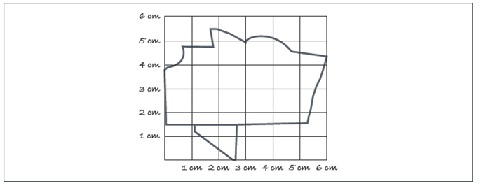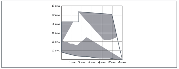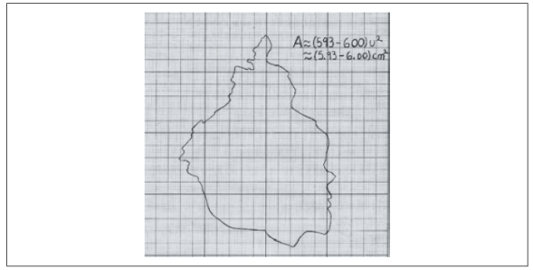 […] haciendo alarde de buena vista y concentración se procede a contar los “cuadritos” realizando ajustes en el caso de los bordes. Es decir, contar 2 por 1 o incluso 3 por 1, dependiendo del porcentaje ocupado. Cabe mencionar que, al realizarlo con otras personas, alumnos voluntarios, se obtuvo una medida de 593 a 600 unidades cuadradas o 5.93 a 6.00 cm2. (Extracto de reporte de Horacio, p. 3).