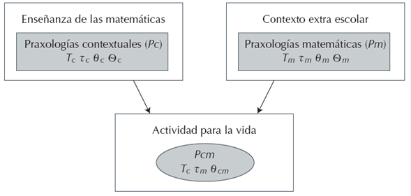 En éste, la tecnología tiene dos componentes uno teórico ( θ th ) y uno práctico ( θ p ). El componente práctico tiene seis funciones tecnológicas: describir, validar, favorecer, explicar, evaluar y justificar el uso de la técnica. Éstas, permiten analizar y evidenciar el tipo de validaciones que se producen al utilizar una técnica matemática para realizar una tarea (matemática o no) en un contexto no escolar. En este caso, P(S) es la disciplina matemática que produce y valida tecnologías matemáticas (como el teorema de Pitágoras) e Iu es una institución usuaria como la Albañilería o la Topografía. Con estos elementos teóricos es posible diseñar actividades para la vida (praxeologías didácticas) en las que se relacionen matemáticas escolares (praxeologías matemáticas o Pm) con matemáticas utilizadas en contextos extra-escolares (praxeologías contextuales Pc), ver figura 2.