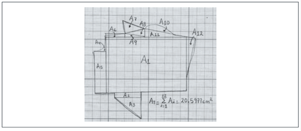 La técnica que se ha denominado Mixta es una “fusión” entre las dos técnicas analizadas previamente. Primero se cuadricula la figura, luego se insertan figuras geométricas conocidas (triángulos y rectángulos principalmente), se cuentan los cuadros en cada figura geométrica y se suman. Dos profesores usan software, mientras que Horacio vuelve a utilizar el papel milimétrico (ver figuras 24, 25 y 26).