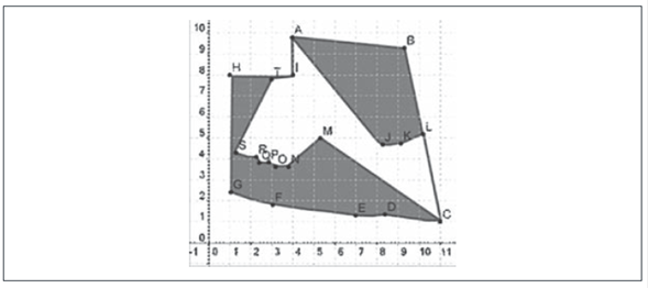 Esta técnica, como su nombre lo indica, consiste en asignar coordenadas a cada uno de los vértices que componen el polígono o la poligonal que representa el terreno. Una vez que se tienen las coordenadas de cada vértice se procede a efectuar el cálculo del área por medio de determinantes, conocida como Gauss Jordan. Generalmente se asignan las coordenadas con datos del terreno (como la altura o distancia a cierto punto de referencia), sin embargo, los profesores asignan las coordenadas de manera “arbitraria”. César y Horacio usan esta técnica para calcular el área del terreno que contiene un lago. Horacio asignó coordenadas generales (ver figura 34) y César procesó la imagen y la ubicó en un plano cartesiano para poder determinar los valores de las coordenadas y hacer los cálculos (ver figura 35).